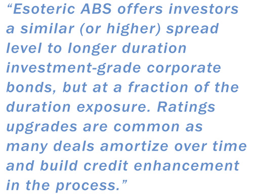 Rotation into structured products is a theme that we’ve seen since the pandemic as investors diversify into options that offer structural protections with shorter duration. Esoteric ABS offers investors a similar (or higher) spread level to longer duration investment-grade corporate bonds, but at a fraction of the duration exposure. Rating upgrades are common as many deals amortize over time and build credit enhancement in the process.